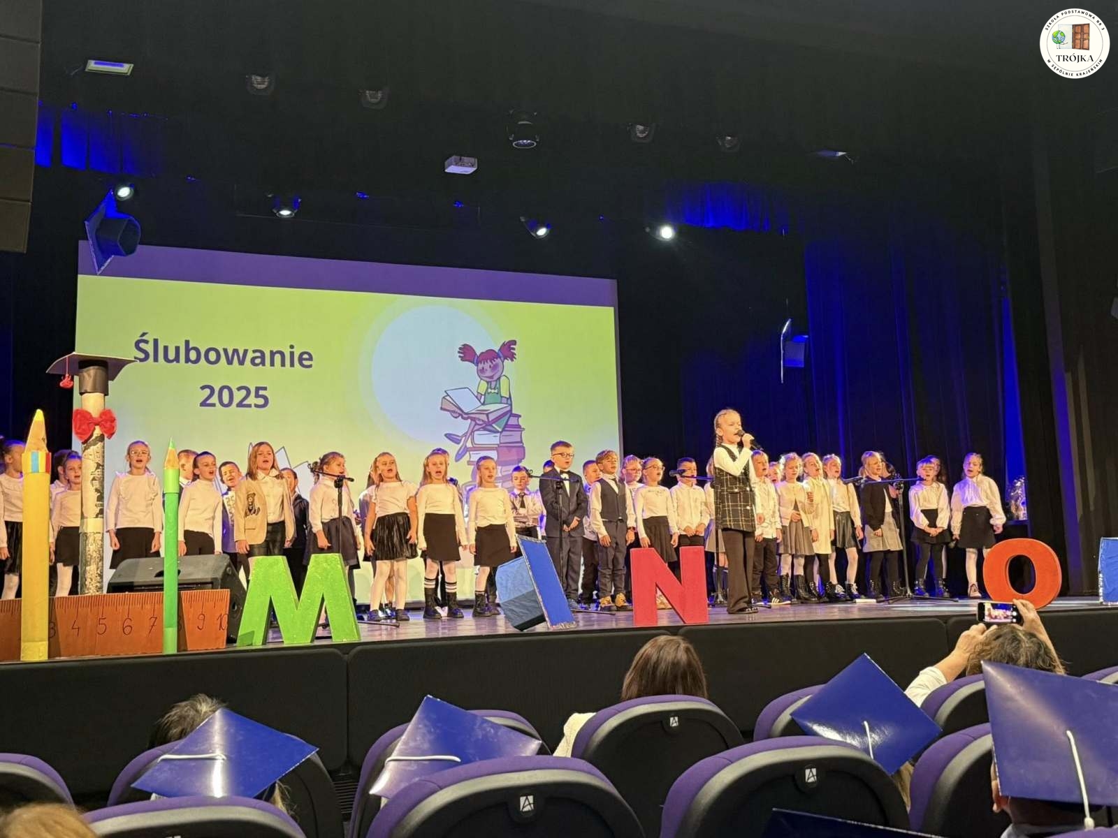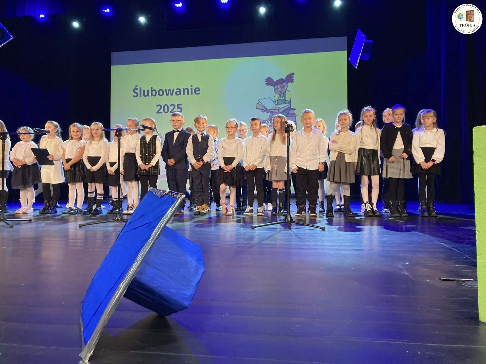 „My, pierwszoklasiści, ślubujemy, że będziemy na każdym kroku, w domu, w szkole, na ulicy, pracować nad sobą, aby wyrosnąć na mądrych ludzi i dobrych Polaków. Dlatego postaramy się dobrze zachowywać i jak najlepiej uczyć.”