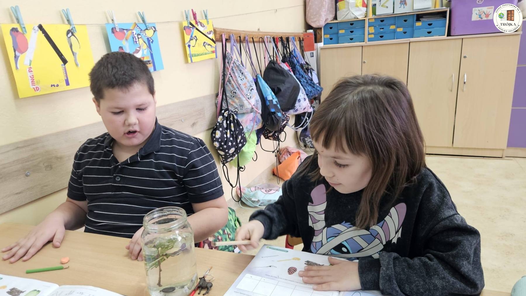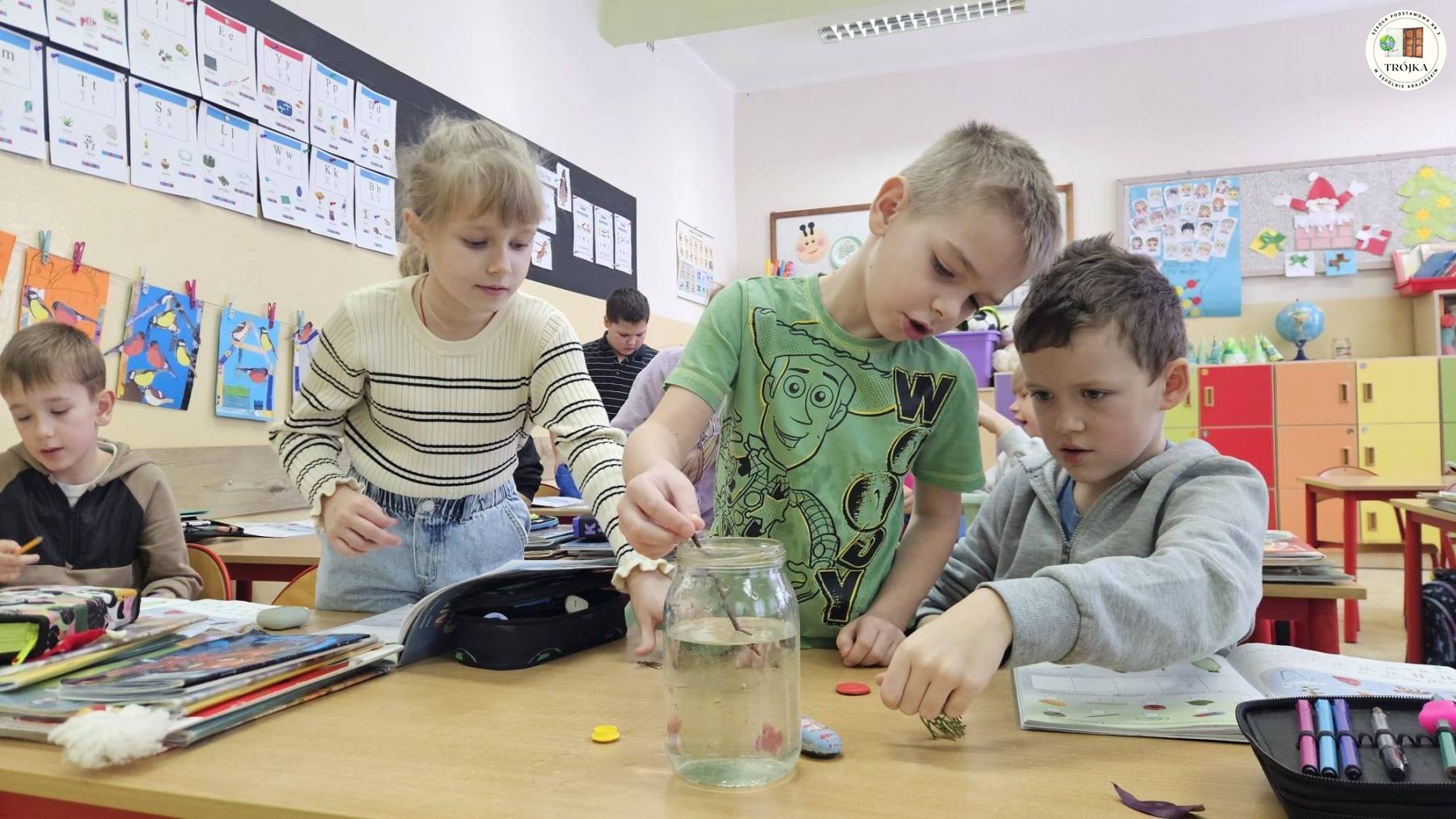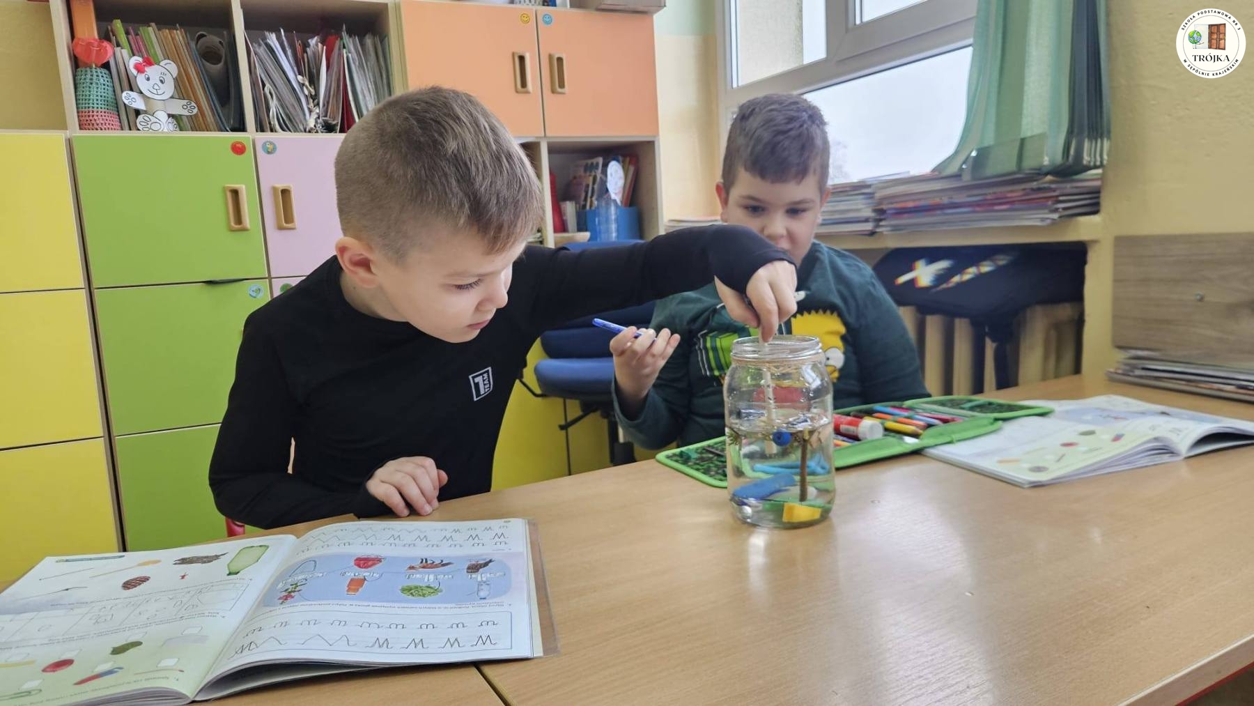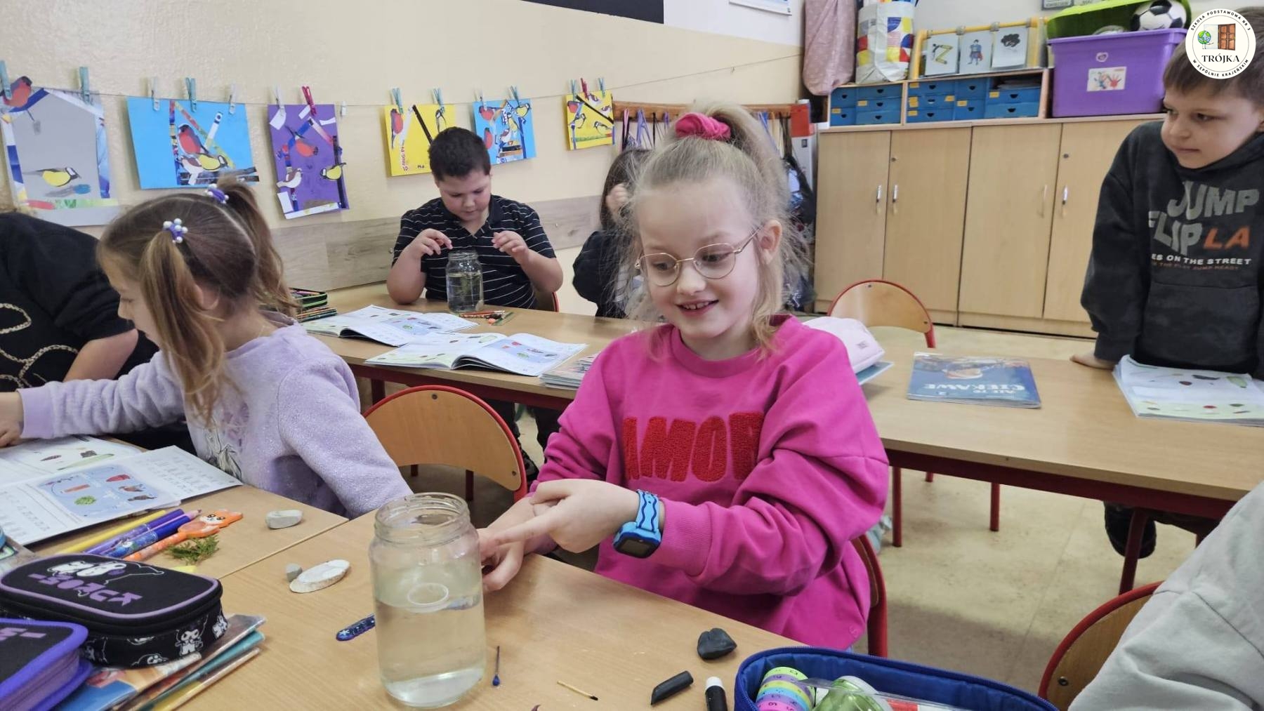 Tematem zajęć było odkrywanie, które przedmioty toną, a które utrzymują się na jej powierzchni. Dzieci z wielkim zaangażowaniem wrzucały do słoików różne drobiazgi: korki, korę , patyki, kamyki, kulkę z plasteliny, spinacze, magnesy itp. Podczas doświadczenia zauważyły, że nie wszystko zachowuje się tak samo.Eksperyment okazał się nie tylko ciekawa lekcja przyrody, ale też świetna zabawa. To była nauka przez doświadczenie- dokładnie taka, jaką lubią.